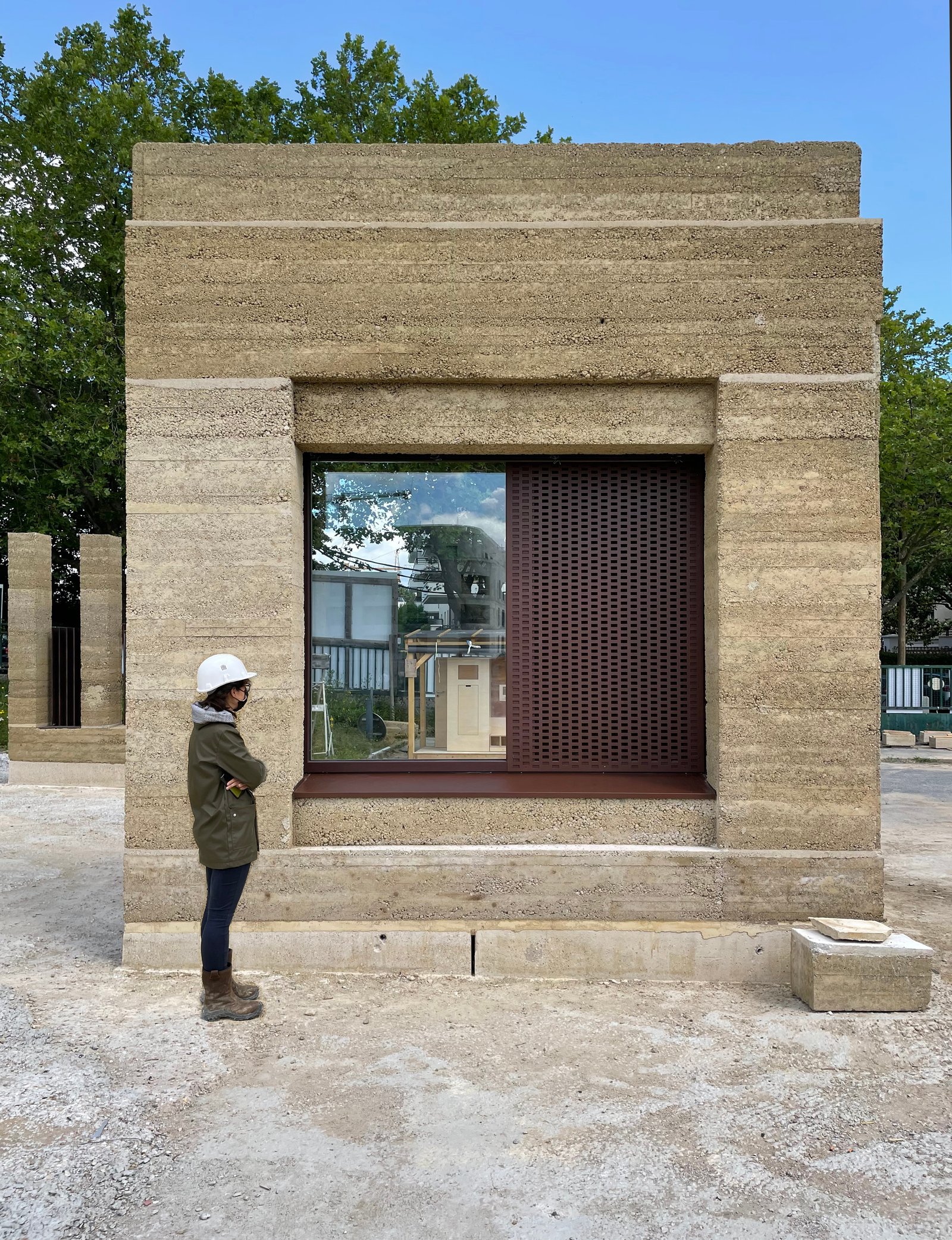 En chantier / CMA / Démarche suivie par l’ADEME / « prototype façade minérale » un béton sec damé – terre et agrégats recyclés du site + charpente bois et cloison « terre/chanvre » >> Plus d’informations