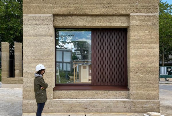 En chantier / CMA / Démarche suivie par l'ADEME / "prototype façade minérale" un béton  sec damé - terre et agrégats recyclés du site + charpente bois et cloison "terre/chanvre"   >> Plus d'informations