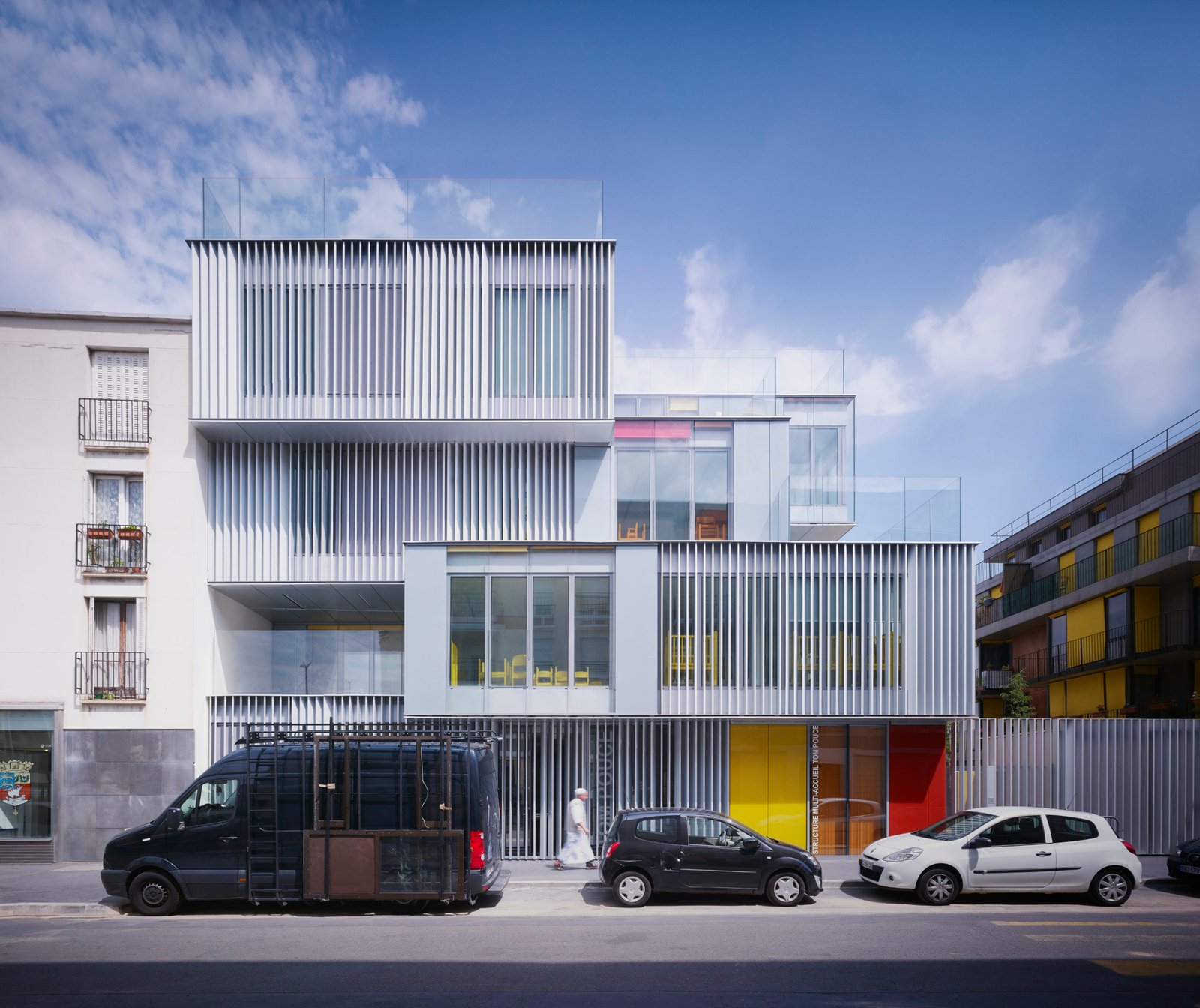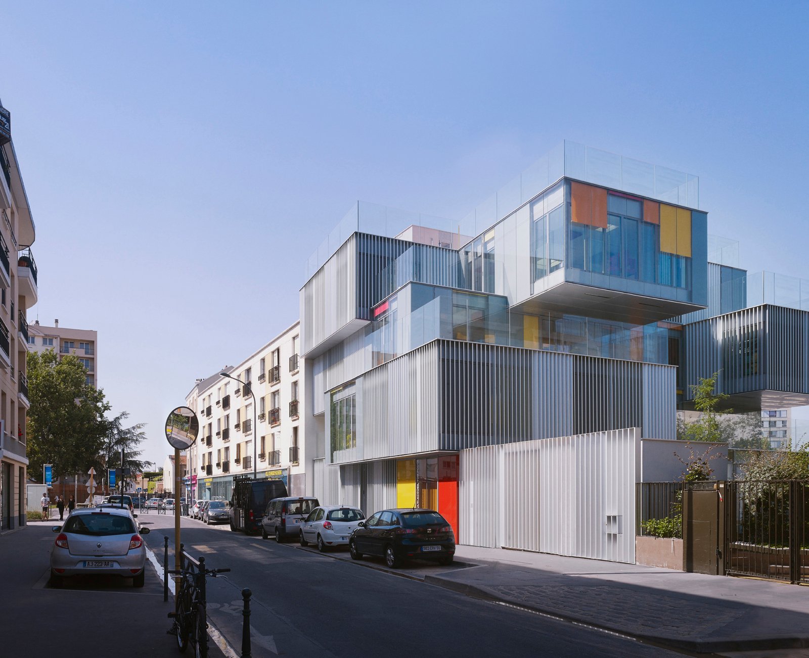 L’accès au bâtiment s’effectue en creux depuis la rue du Ménil, abrité sous le porte-à-faux de l’étage. Large et lumineux, le hall permet aux usagers de circuler comme d’échanger aisément. Dès l’entrée, on perçoit la zone de psychomotricité largement ouverte sur la cour commune et le square très arboré au travers de la ludothèque.