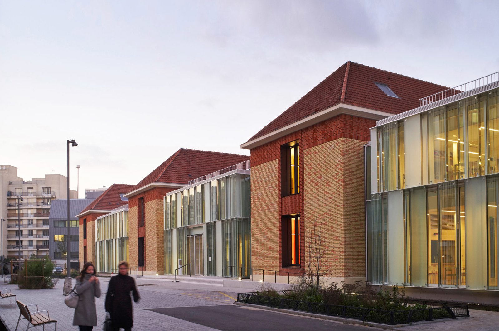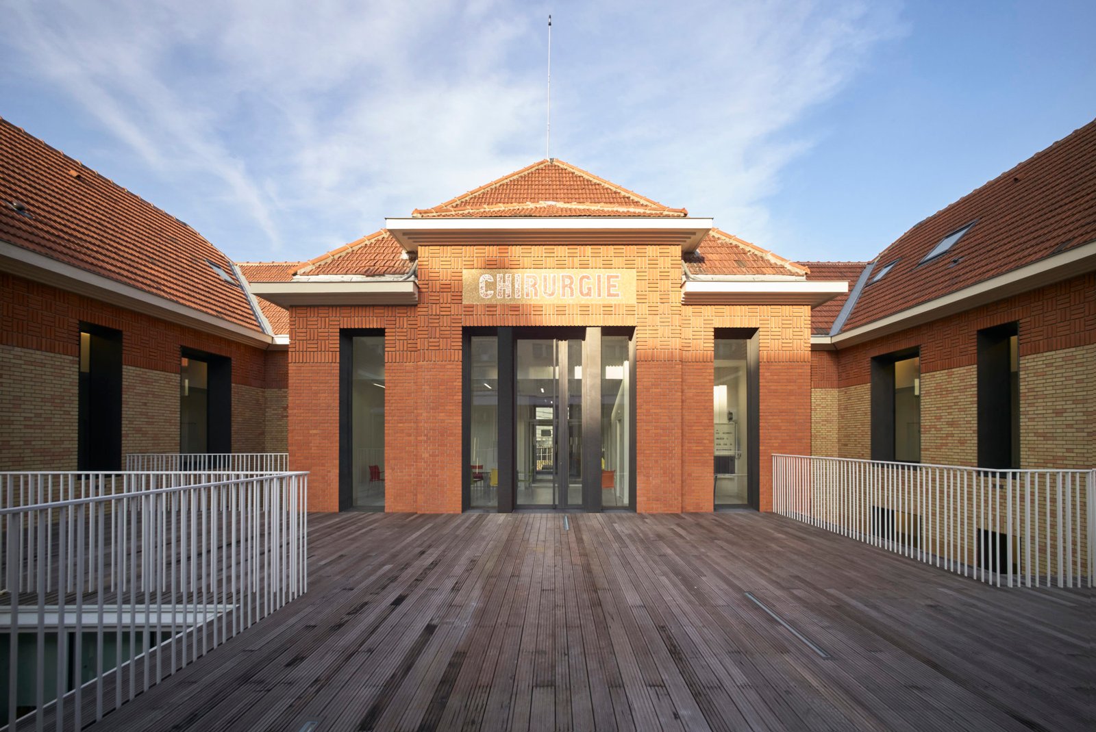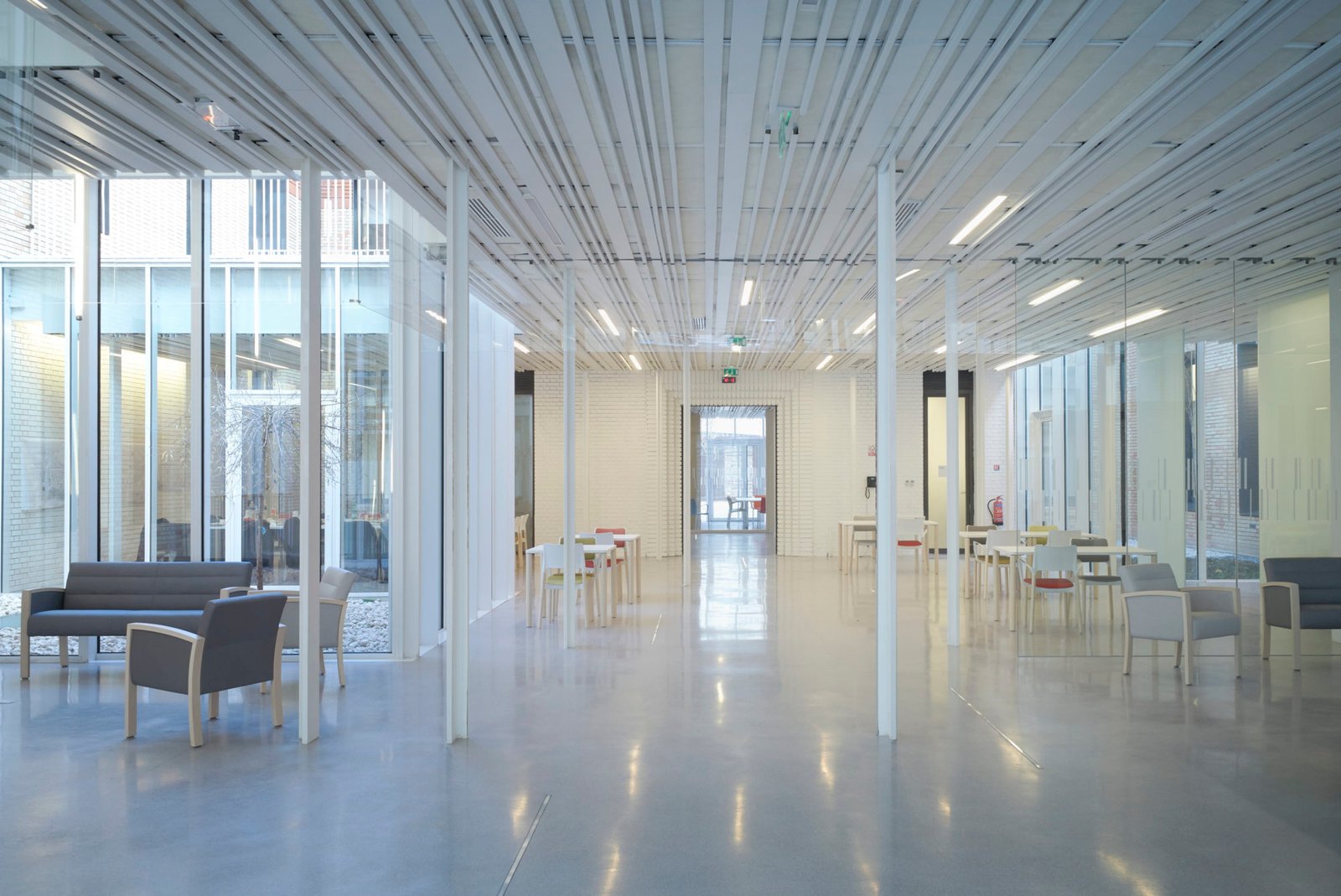 Trois pavillons abstraits offrent une lecture évidente de l’intervention. Ils s’implantent entre les ailes et accueillent les espaces de vie. Ils s’ouvrent sur la ville avec une enveloppe en double peau de verre clair et dépoli.