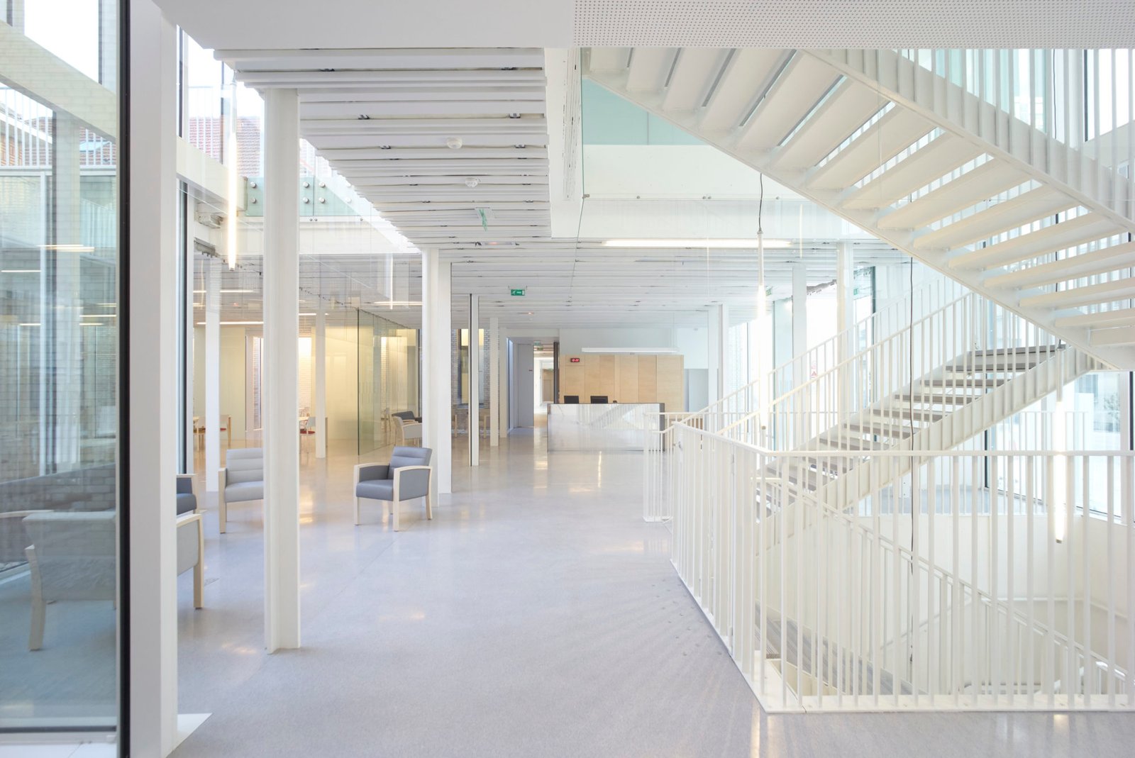 L’administration et l’accueil de jour en contre-bas sont accessibles directement par un grand escalier ouvert.