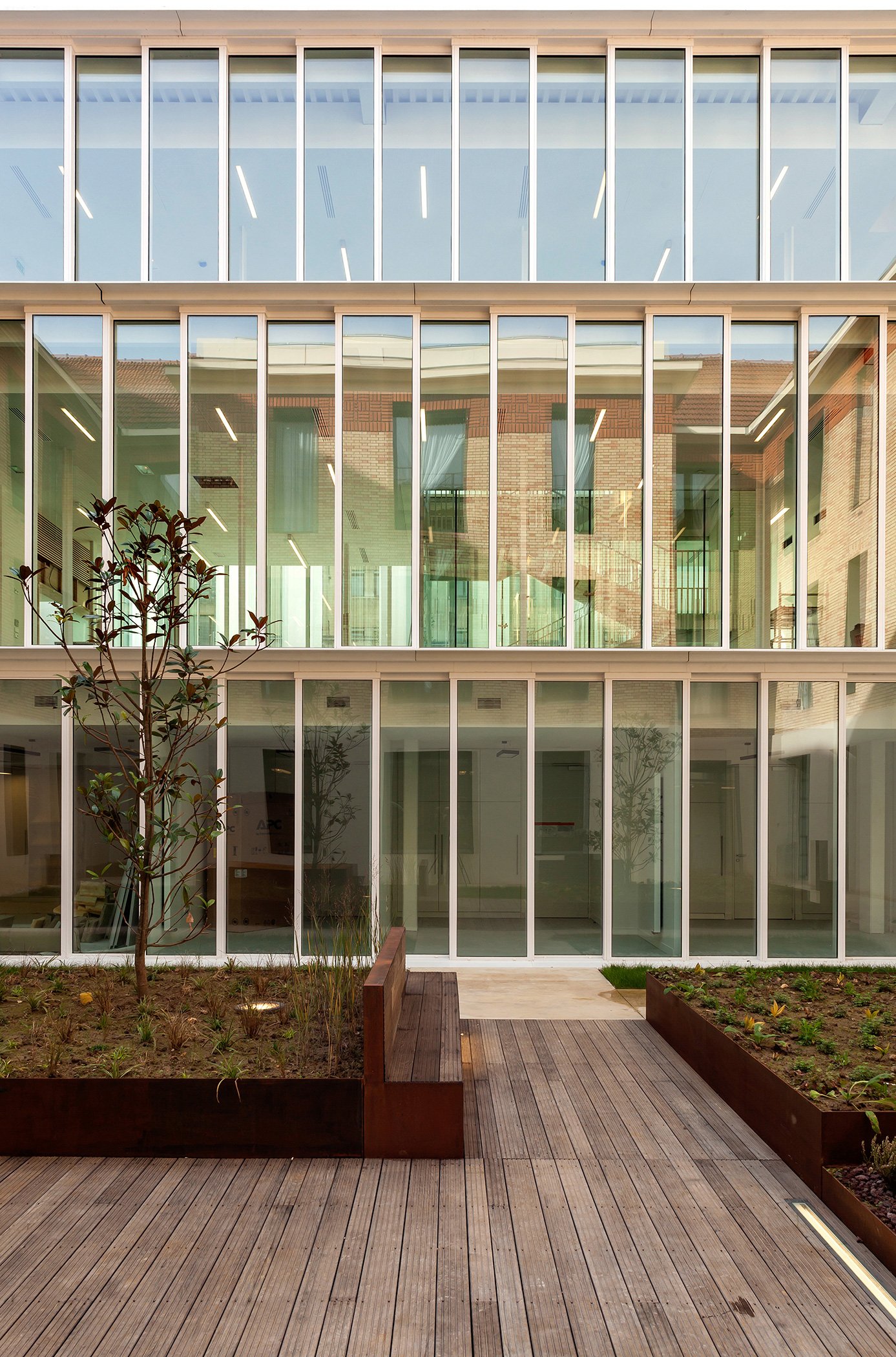 Le bâtiment s’organise autour de grands patios. Ils permettent la déambulation et l’accès à chaque niveau à des espaces extérieurs sécurisés.