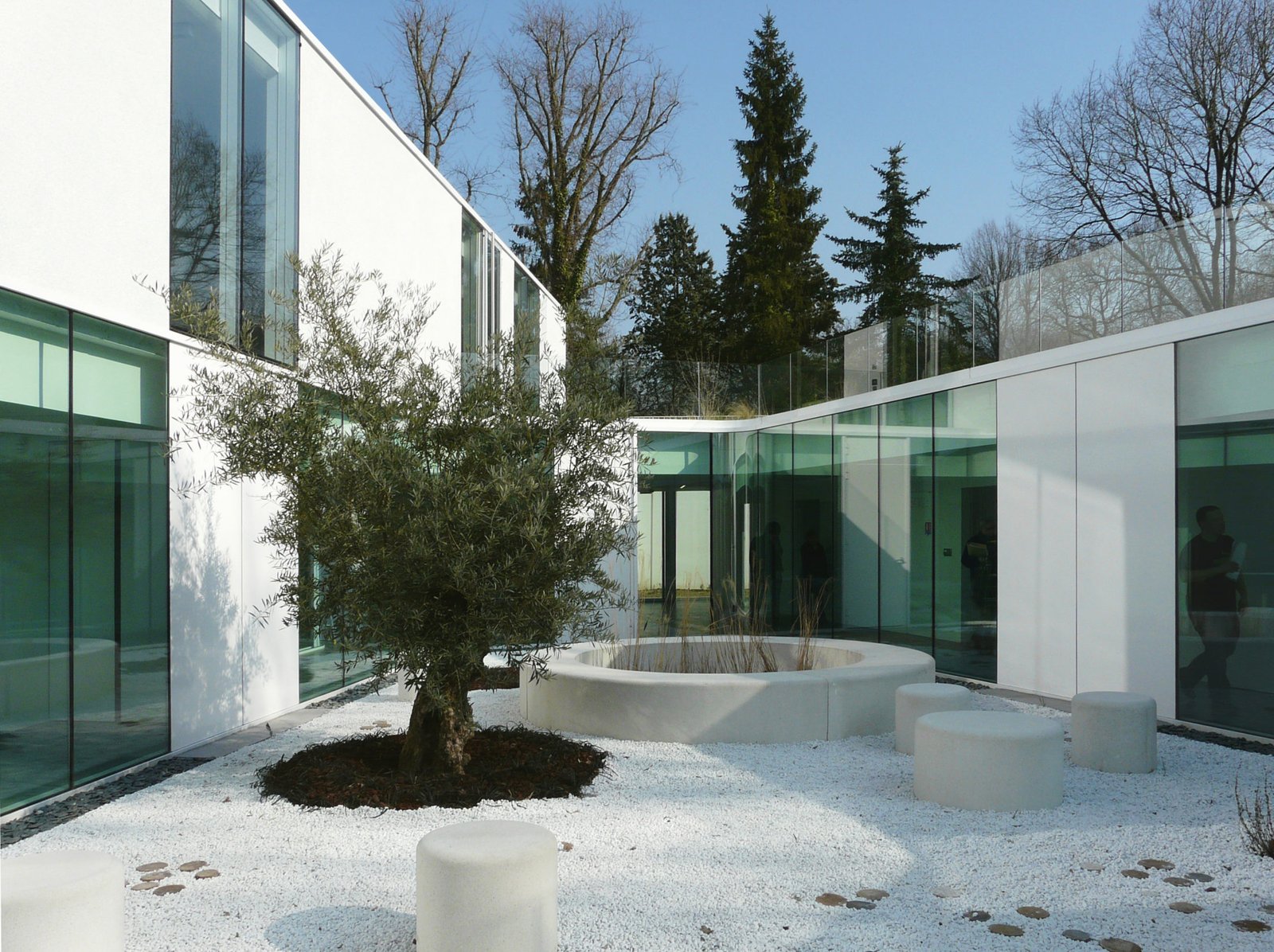 La peau en enduit est perlée de billes de verre scintillantes, telles des gouttes de rosée, apportant au bâtiment une aura. Dès la poche d’entrée, c’est un extérieur que l’on découvre. Un des quatre vides organisant l’espace intérieur. En effet, l’unité à rez-de-chaussée se développe autour de 3 patios. Les chambres sont traversantes, organisées autour du grand patio central, et donnant vers le jardin périphérique qui rassure avec ses murs de soutènement épais recouverts de végétal. Chaque chambre en possède un morceau au travers d’un grand bout de verre toute hauteur projetant la vue vers l’extérieur. La chambre, individuelle, petite, est « domestique ». Le lit est en creux dans une alcôve, le bureau encastré dans le mur et la salle de bain dissimulée derrière une porte sous tenture camouflée dans la couleur.