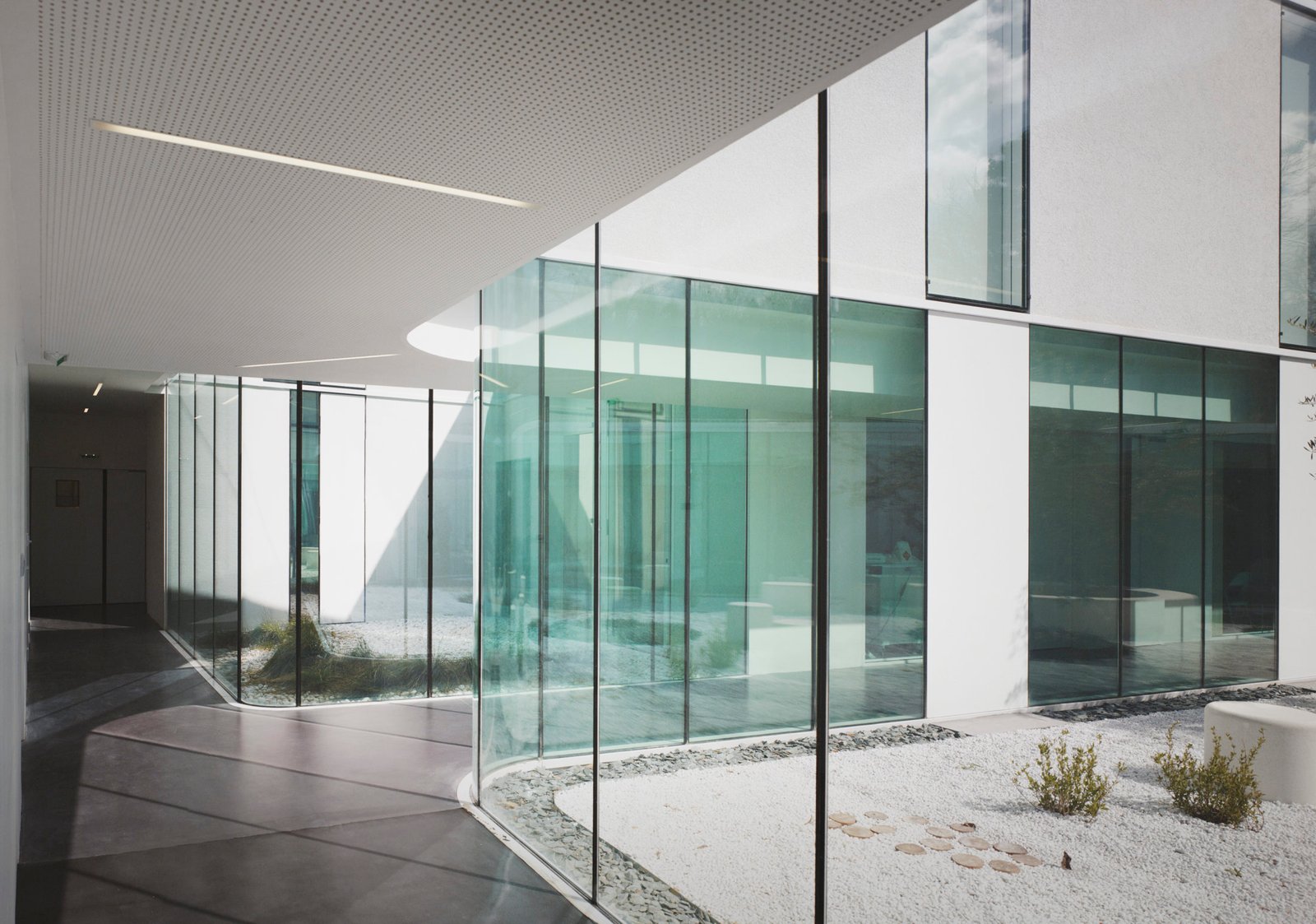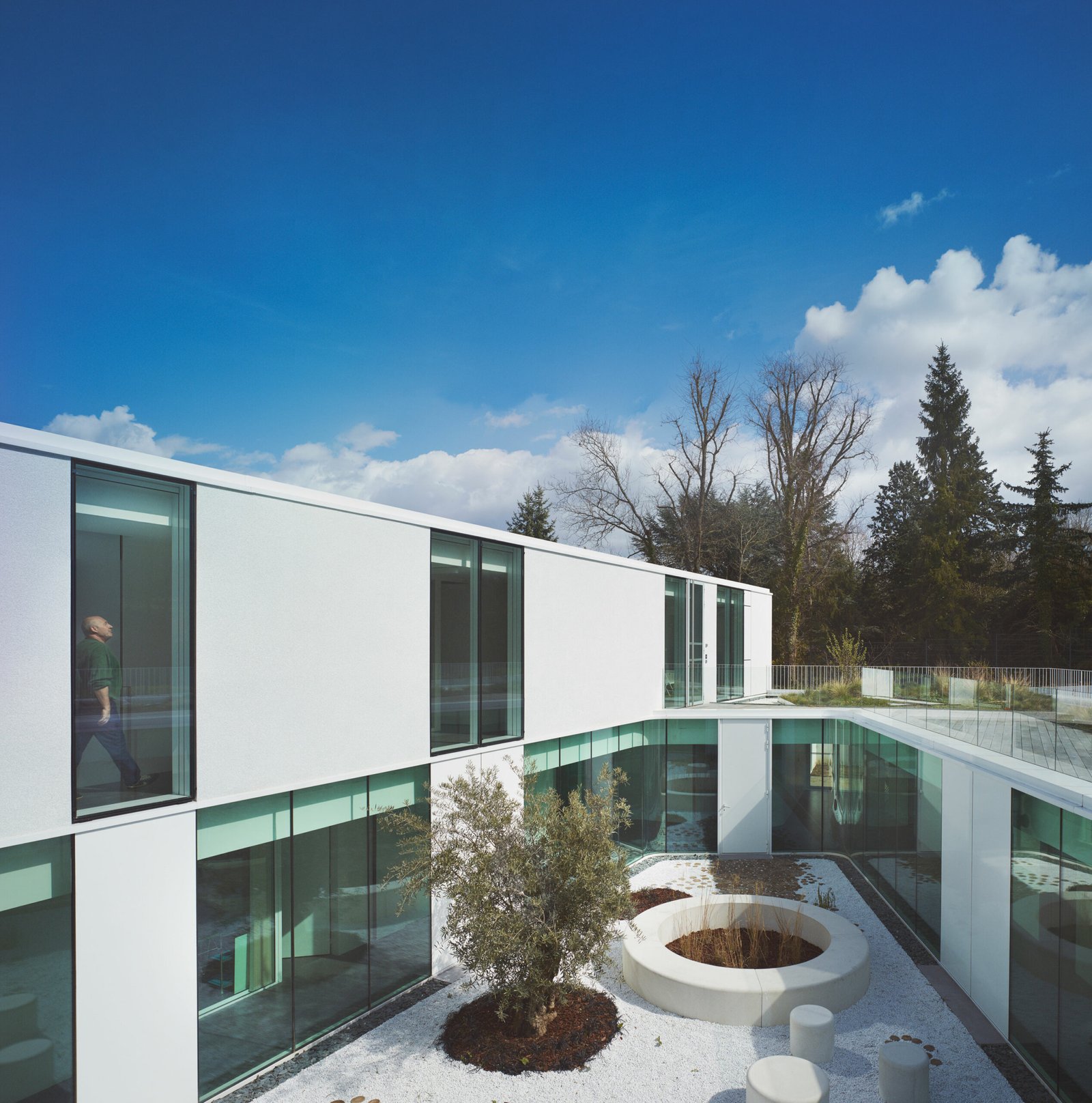 Les enfants sont des résidents temporaires. Partout, l’œil trouve une fuyante, un angle « d’évasion ». L’espace courbe, fluide, invite à la déambulation. Les verres bord à bord effacent les limites pour retrouver le contact avec mère nature. La lumière naturelle est partout, comme le sourire aux lèvres des enfants. L’étage partiel accueille l’hôpital de jour avec ses salles d’activités, de jeux, ainsi que les bureaux des médecins, eux aussi traversants, entre patios et nature. au travers d’une grande terrasse plantée ouverte sur la forêt.