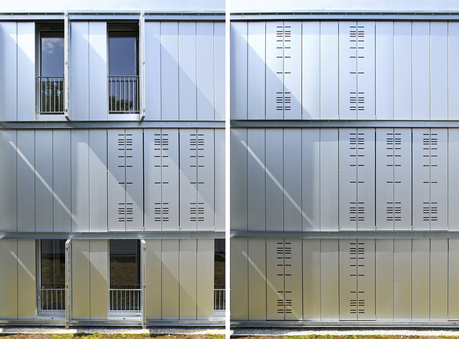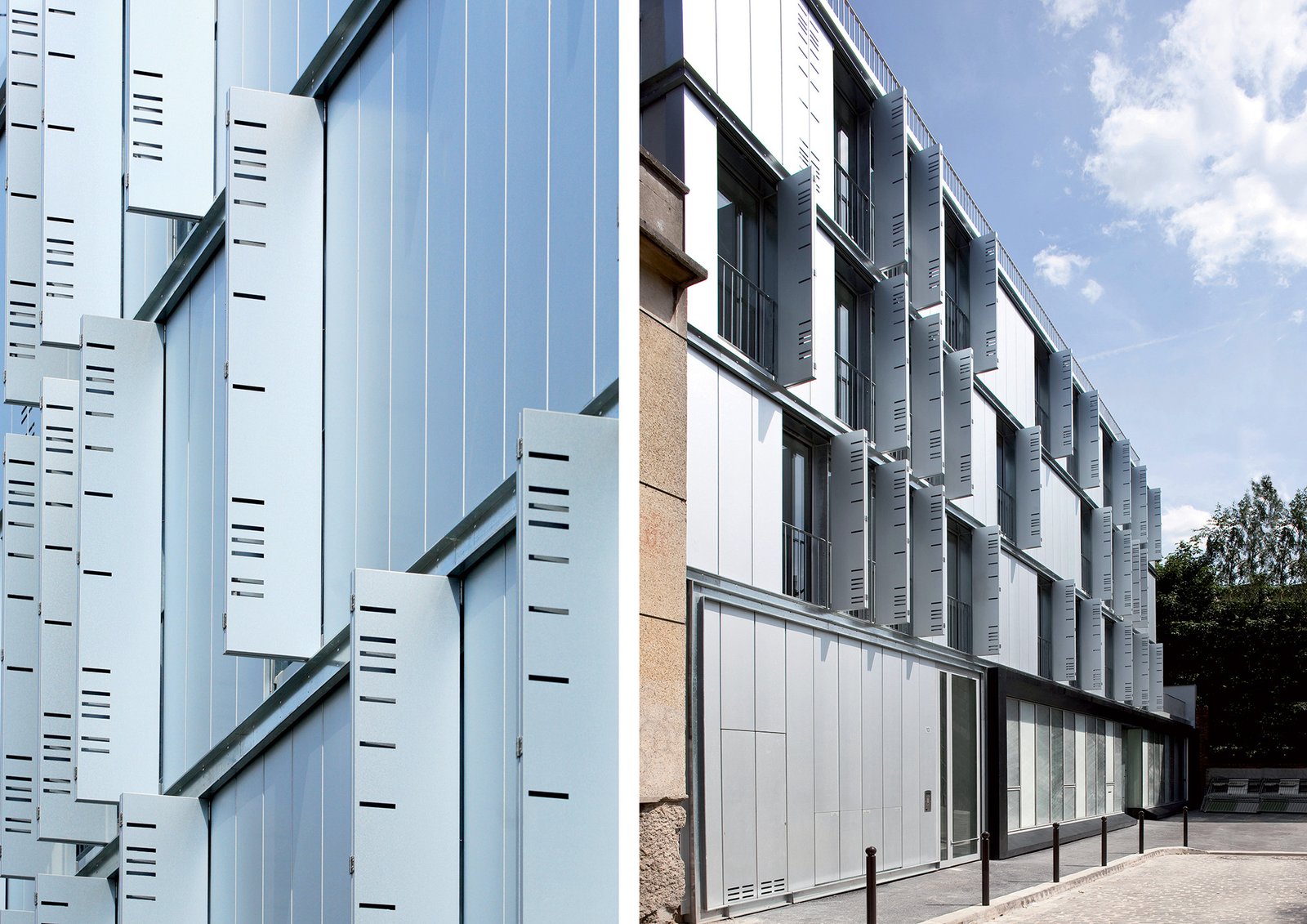 Les logements, bien distincts, forment un volume simple et homogène dans lequel l’équipement vient s’encastrer au rez-de-chaussée. L’enveloppe de métal reconstitue ce volume une fois les volets fermés. Avec des surfaces communes réduites, ils offrent des typologies variées, du T2 avec patio au T4 triple orientation sur terrasse végétalisée.