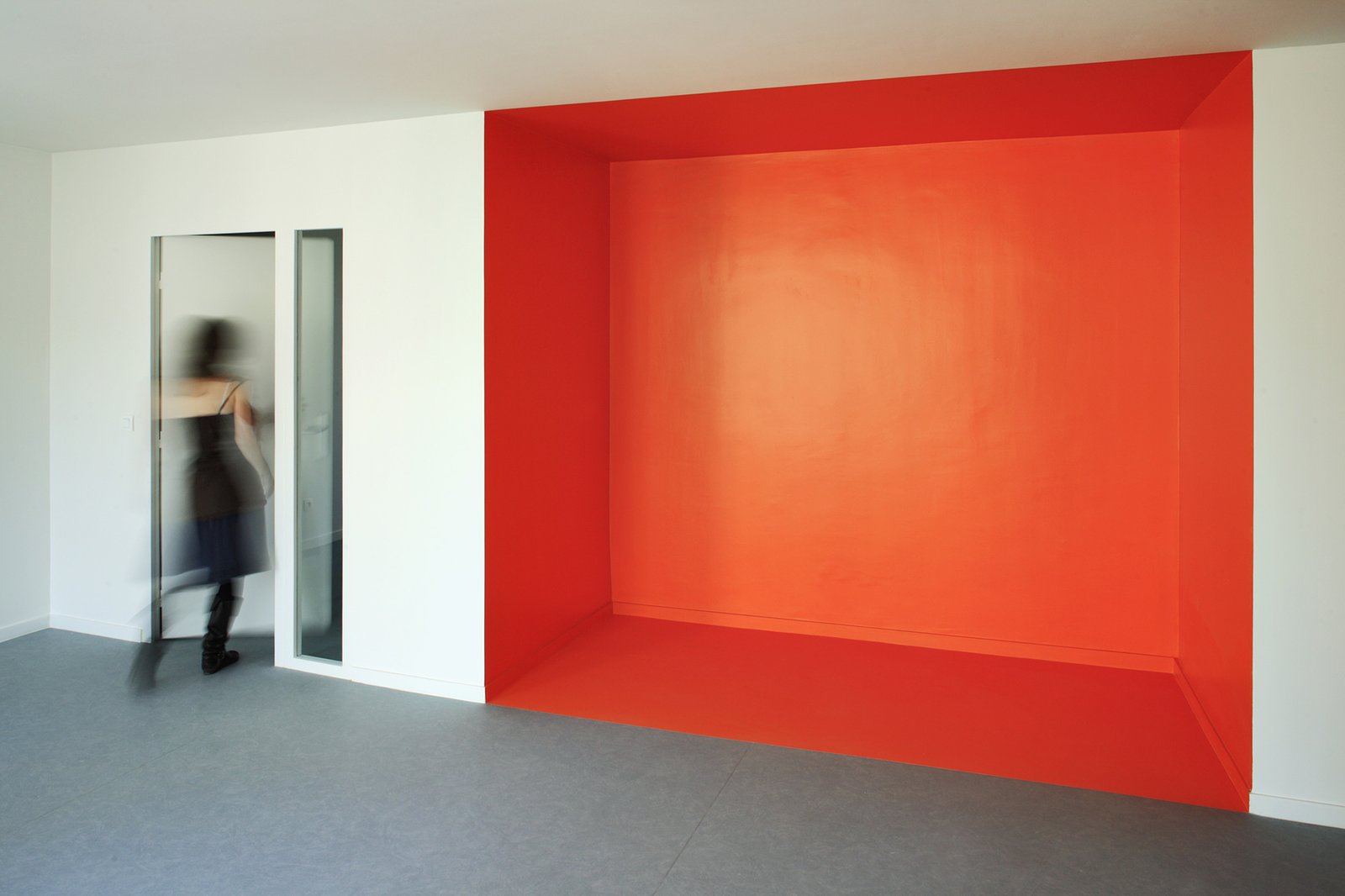 À l’intérieur, les fonctions sont clairement identifiées par les traitements de façades et la couleur : sur rue, les locaux administratifs et du personnel (blanc/gris) ; sur cour, les espaces dédiés aux enfant (vert) avec au centre leurs locaux d’accompagnement (orange).