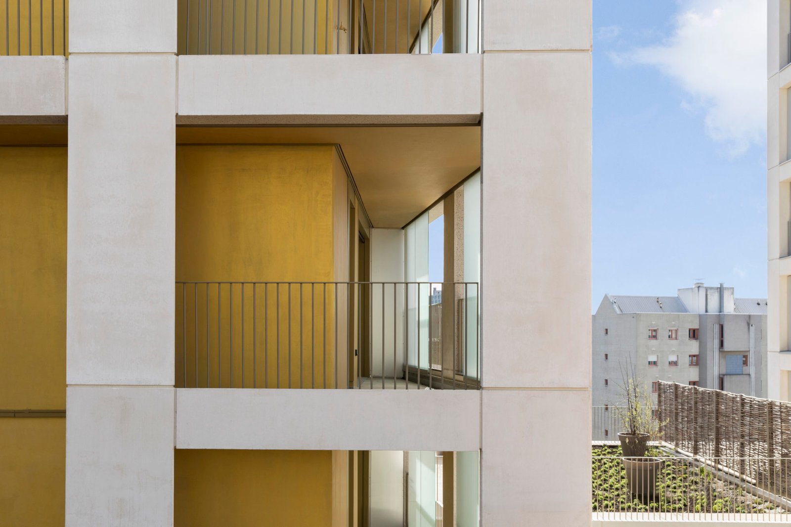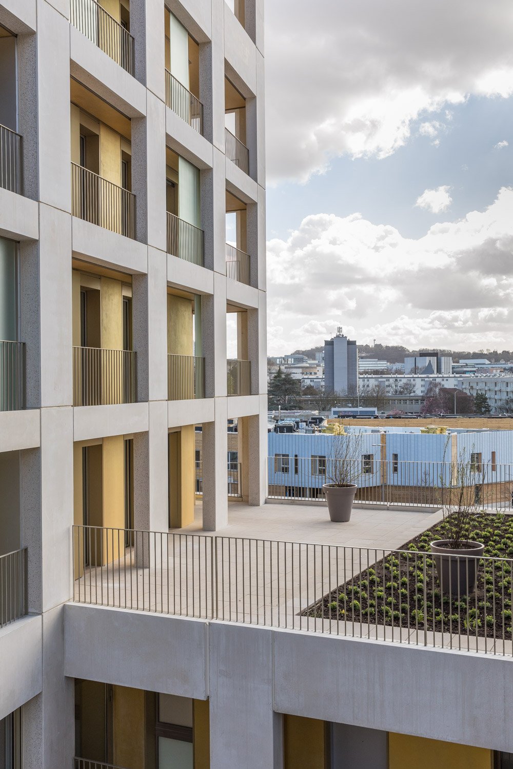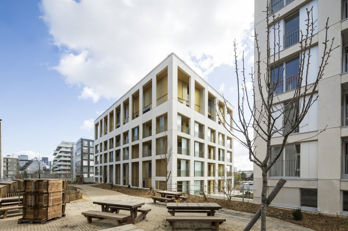 La démarche s’inscrit dans un souci véritable d’innover autant sur les modes d’habiter le collectif que sur la fabrication de celui-ci. Le procédé de construction d’une grille préfabriquée en atelier a permis une rapidité de montage et un confort de travail pour les ouvriers. Il offre également les avantages d’un chantier propre avec des nuisances très réduites et une qualité irréprochable des ouvrages en béton blanc sur le plot Est. Ces derniers éléments préfabriqués, de forme trapézoïdale, jouent suivant l’angle de vue entre épaisseur massive et bouchardée ou feuille de béton lisse, offrant des vues orientées vers la Défense. L’arrière-plan des coursives aux sur-profondeurs joue d’une teinte dorée reflétant la lumière à l’Est et sur les niveaux de raccord.