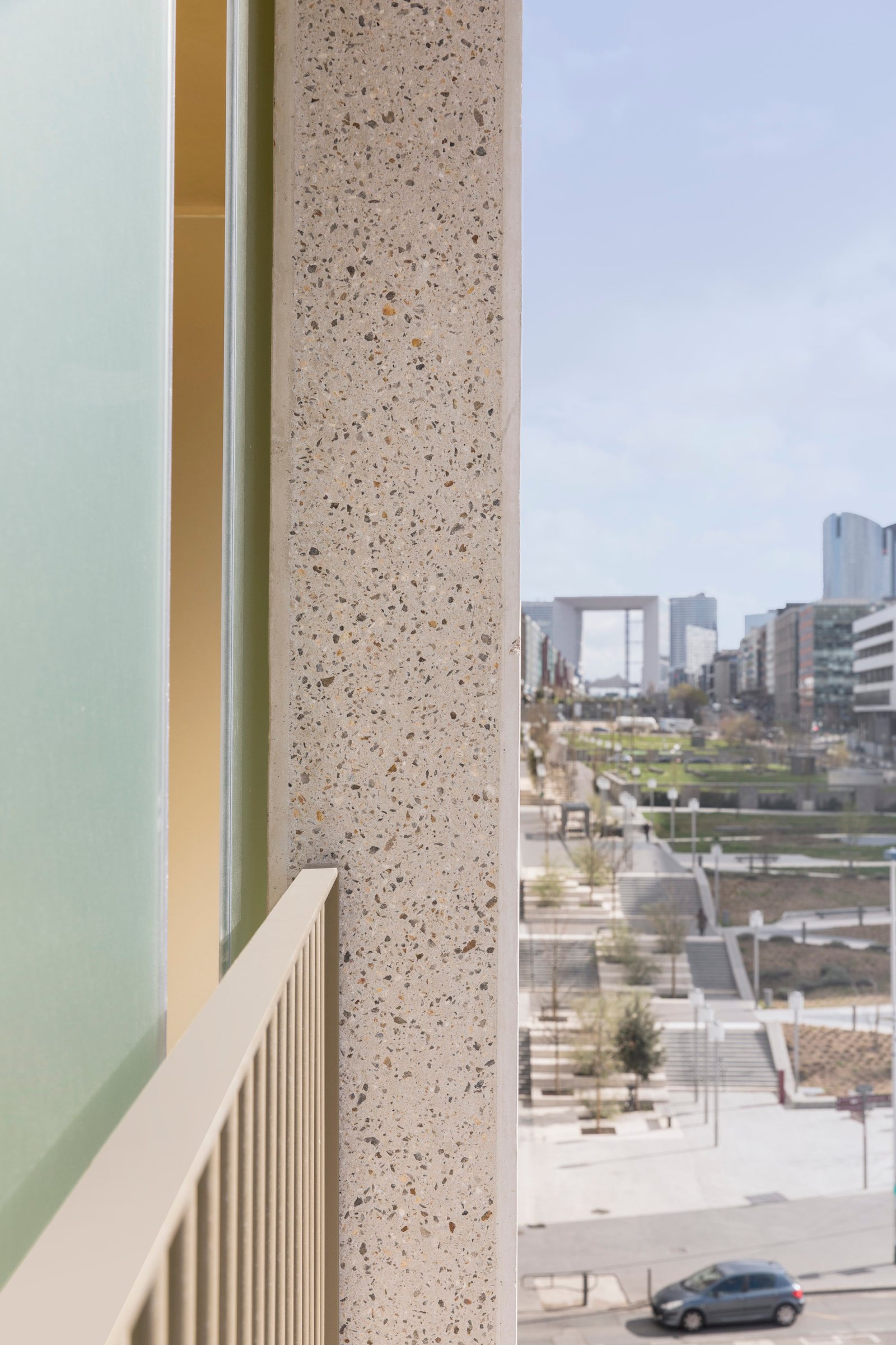 Le projet fait l’articulation entre bureaux et logements, il s’intègre dans la silhouette des façades donnant sur les Terrasses de la Défense par deux plots à la matérialité différente, dans le prolongement du séquençage de l’axe de la Grande Arche.