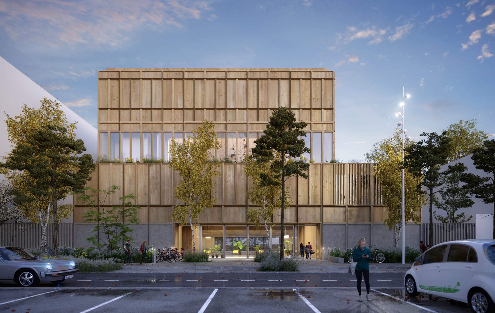 Le bâtiment à la silhouette découpée est loin du simple parallélépipède monolithique. Ce choix nous permet de créer un effet de socle par un décroché du volume (h=9 m environ) tout en ayant une matière différente en soubassement afin de donner un rapport à la rue plus adapté à l’échelle du piéton.