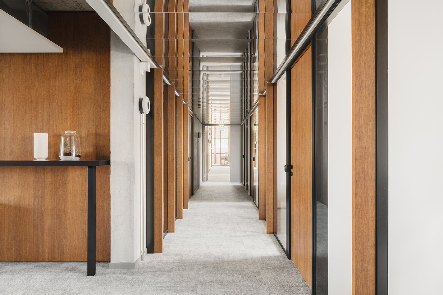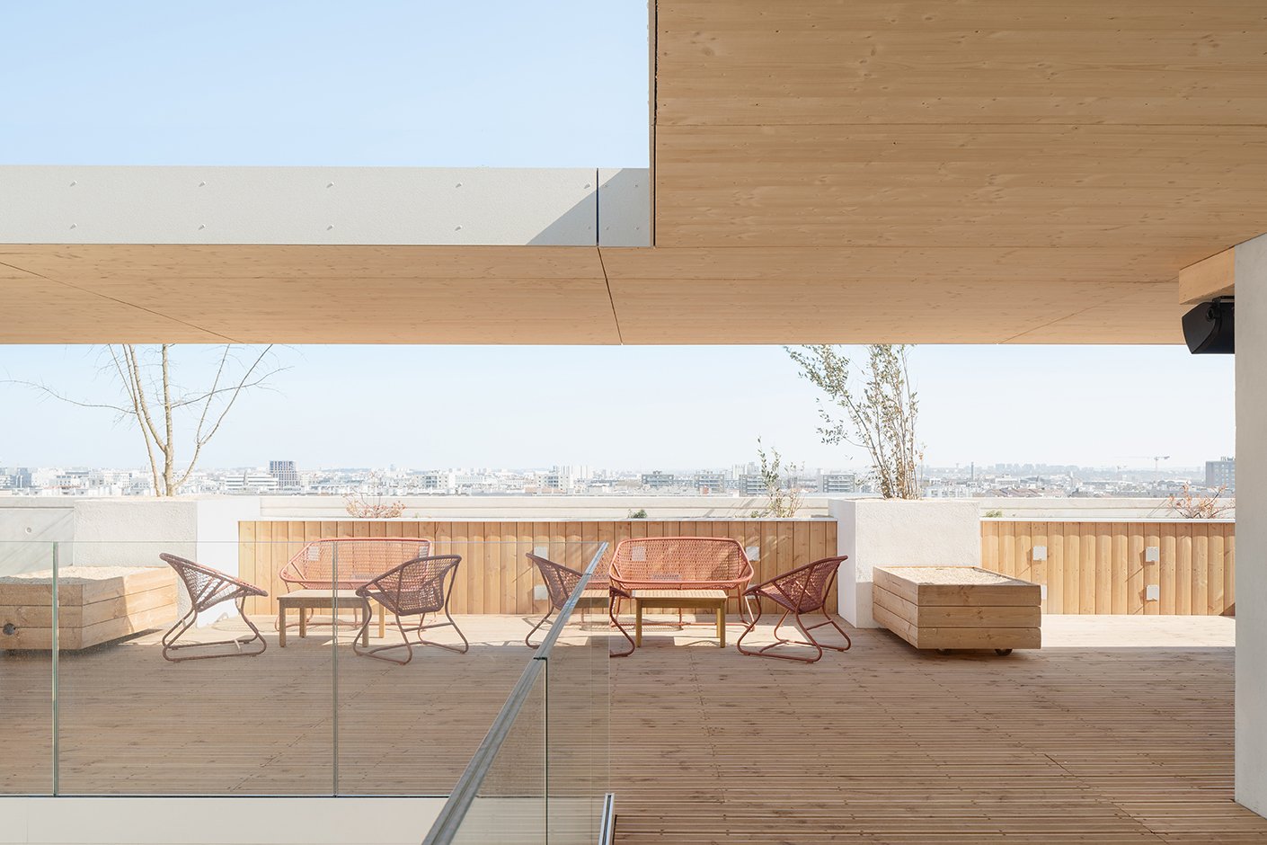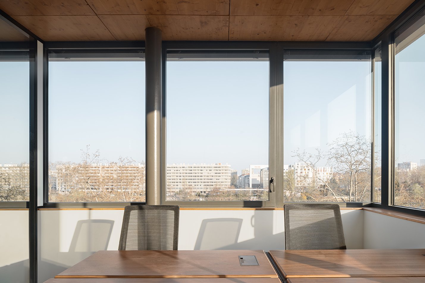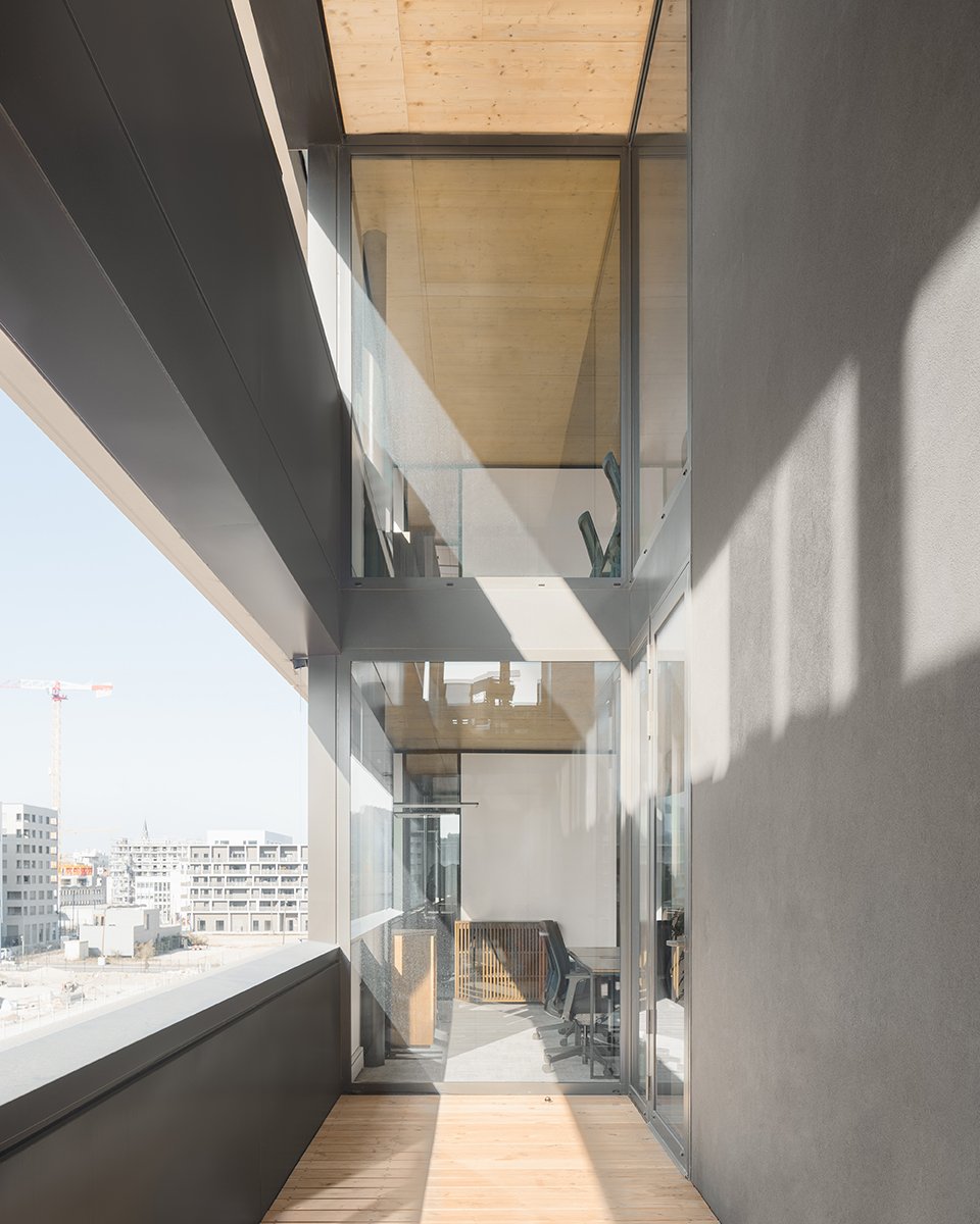 La richesse de ses espaces se dévoile au fur et à mesure qu’on le parcourt. Des évènements lumineux, qu’ils soient naturels ou artificiels, caractérisent chaque espace, dessinent des lieux forts, intimes et généreux sans rendre le bâtiment ostentatoire mais en lui donnant une présence plus immuable, voir immatérielle. Ils révèlent un travail d’acuponcture et mettent en avant des espaces intimes et contenus, intérieurs & extérieurs. Sa prouesse structurelle maîtrisée en fait un bâtiment hôte capable de s’adapter. Elle lui permet aussi d’échanger et de communiquer à l’extérieur avec le grand public par la totale transparence du rez-de-chaussée. En parallèle, les étages offrent des plateaux de bureaux libres, ultra flexibles, panoramiques, aux ambiances feutrées … ils sont mis en relation par des vides intérieurs en double hauteur ou des terrasses partagées.