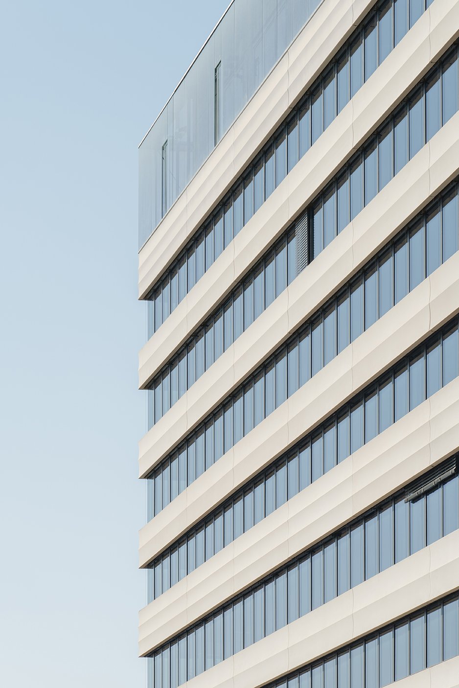 Les façades sont travaillées selon un principe en bandeau, d’une teinte claire, légèrement ocre, et texturé, alternant minéral et vitrage aux hauteurs différentes. Elles accrochent la lumière, génèrent des ombres et offrent une nouvelle typologie dans l’environnement architectural des quais marqué par des jeux de trames plus carrées.