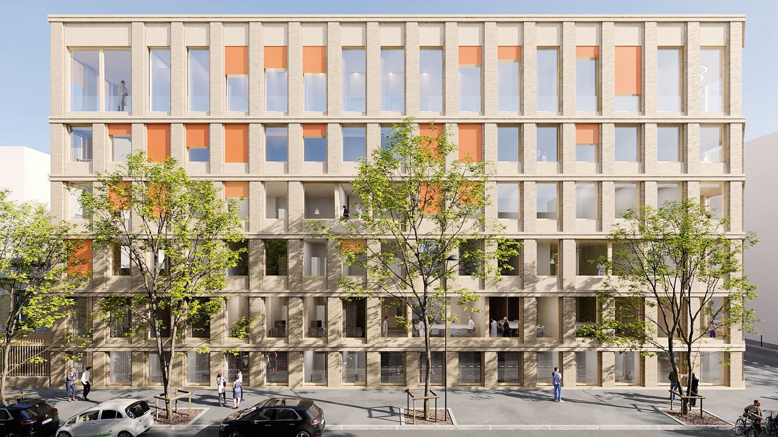 Toute la découpe, le tramage et le rythme de façade a été réfléchit pour domestiquer le bâtiment à l’échelle du patient : création d’allège pleine de différentes hauteurs, largeurs de baies adaptées aux usages des différents espaces, création de séquences d’intimités et de filtre afin de créer de la rugosité, de l’intimité et une domesticité.