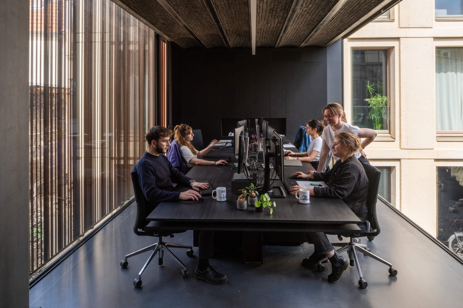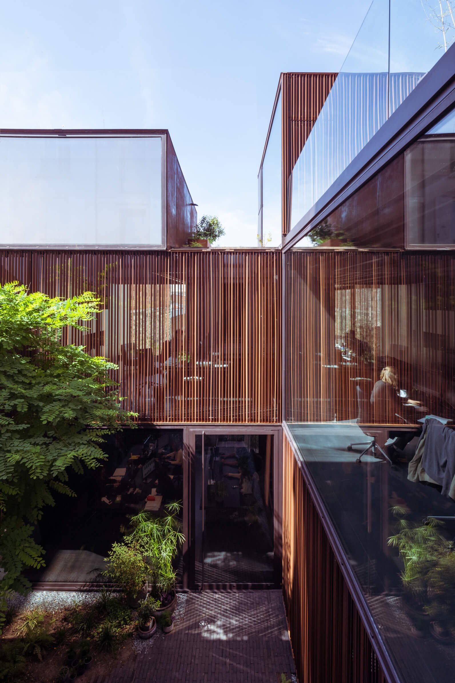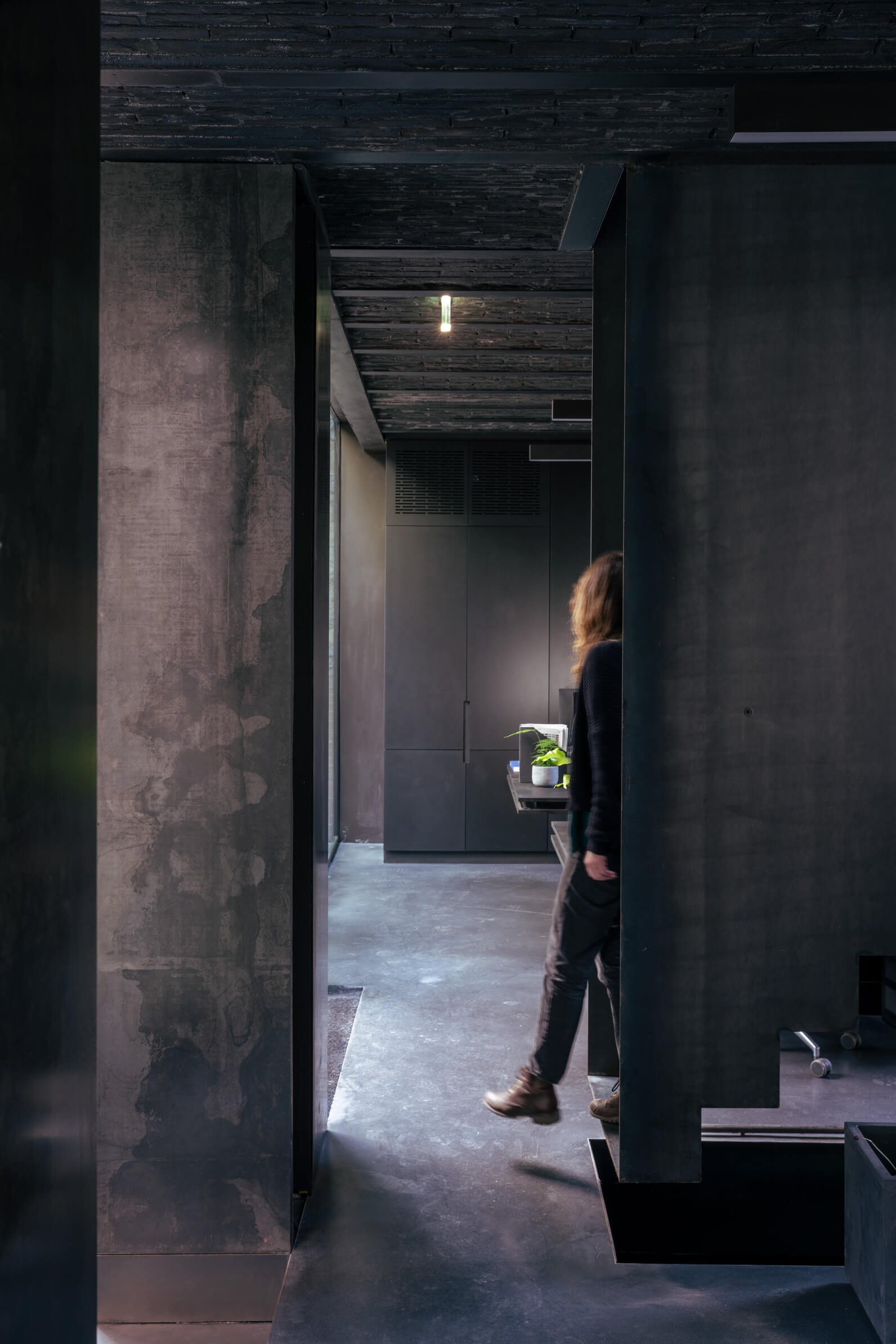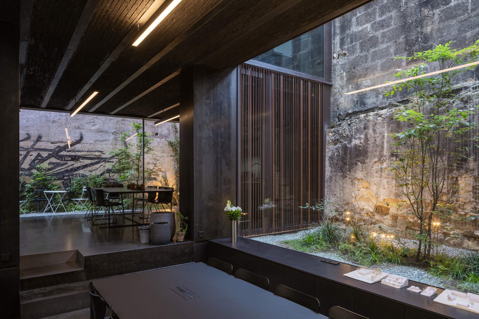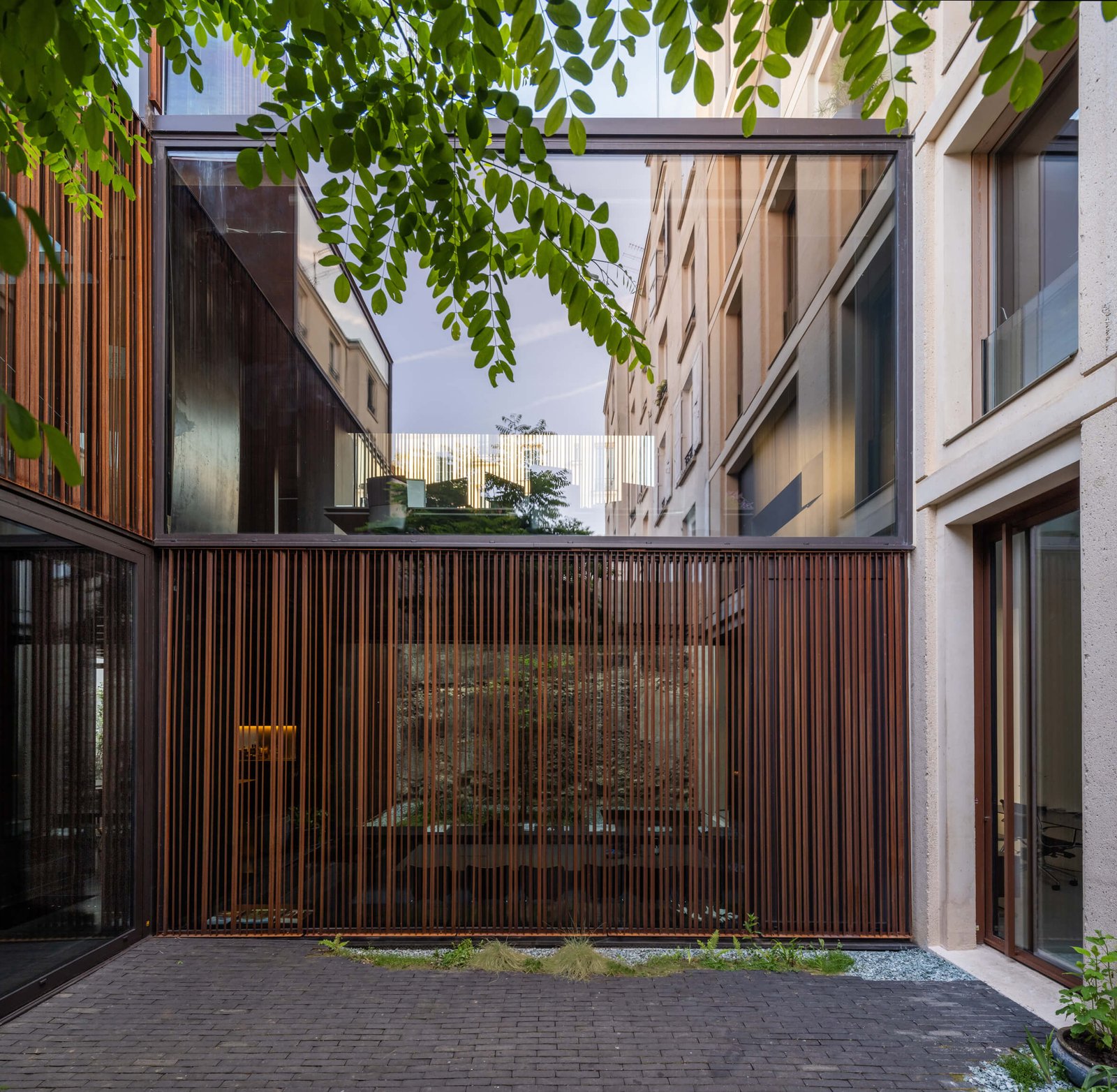 Les sous-sols deviennent des niveaux de vie, creusés dans la fraîcheur de la terre, éclairés par des patios vers lesquels ils s’ouvrent. La hauteur sous plafond amplifie le silence et les volumes. Les limites se dissolvent dans la transparence des vitrages toute hauteur, et l’on est projeté vers l’extérieur, happé par le végétal, enveloppé par la lumière. Grâce à la fluidité des circulations, un courant d’air vertical s’établit, un souffle, une respiration d’ensemble. Au fil des cheminements intérieurs, des échappées visuelles discrètes surgissent à l’improviste, comme autant de surprises suspendues. Chaque pli du bâtiment dessine un origami monumental, où les géométries se déclinent en une suite de plans pleins, creux ou ajourés – une composition complète où la matière se transforme à chaque inflexion. Le plan du logement est simple, presque archétypal : un carré, découpé en neuf cases, avec un vide au centre. Au cœur des bureaux, un escalier recyclé, pliure japonisante en acier, s’enfonce dans la terre et s’élève vers les hauteurs. Un tunnel suspendu. Autour des vides s’agencent logements, bureaux, jardins, escaliers, circulations. Le dedans et le dehors s’imbriquent dans une continuité souple. Les châssis coulissants, dissimulés dans l’épaisseur du mur, permettent d’ouvrir des pans entiers de façade, révélant un jeu subtil de reflets, de profondeurs et d’apparitions. Le mystère naît du glissement des seuils, d’un espace qui se dilate ou se rétracte, toujours prêt à accueillir le silence, le vent et la lumière.