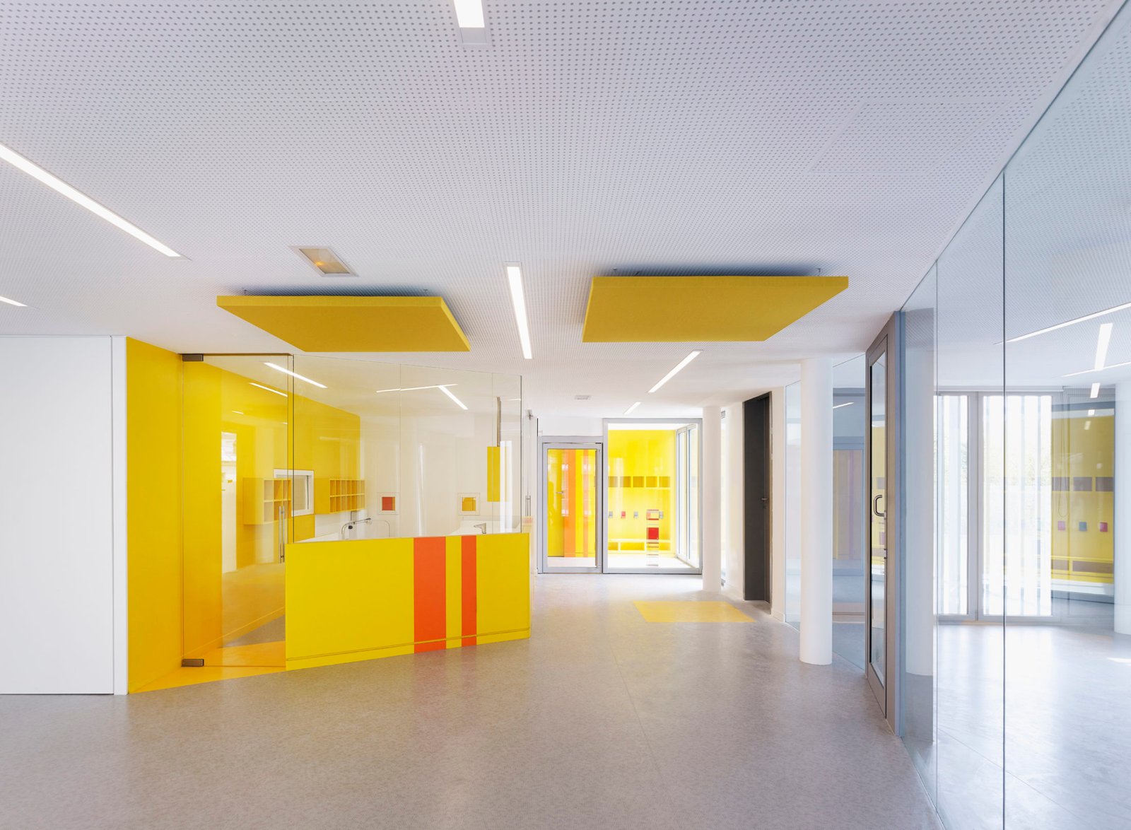 L’accès au bâtiment s’effectue en creux depuis la rue du Ménil, abrité sous le porte-à-faux de l’étage. Large et lumineux, le hall permet aux usagers de circuler comme d’échanger aisément. Dès l’entrée, on perçoit la zone de psychomotricité largement ouverte sur la cour commune et le square très arboré au travers de la ludothèque.