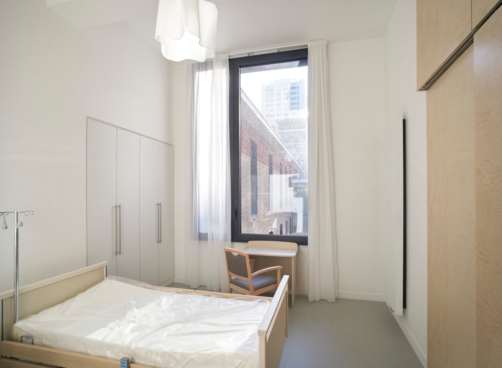 Trois pavillons abstraits offrent une lecture évidente de l’intervention. Ils s’implantent entre les ailes et accueillent les espaces de vie. Ils s’ouvrent sur la ville avec une enveloppe en double peau de verre clair et dépoli.