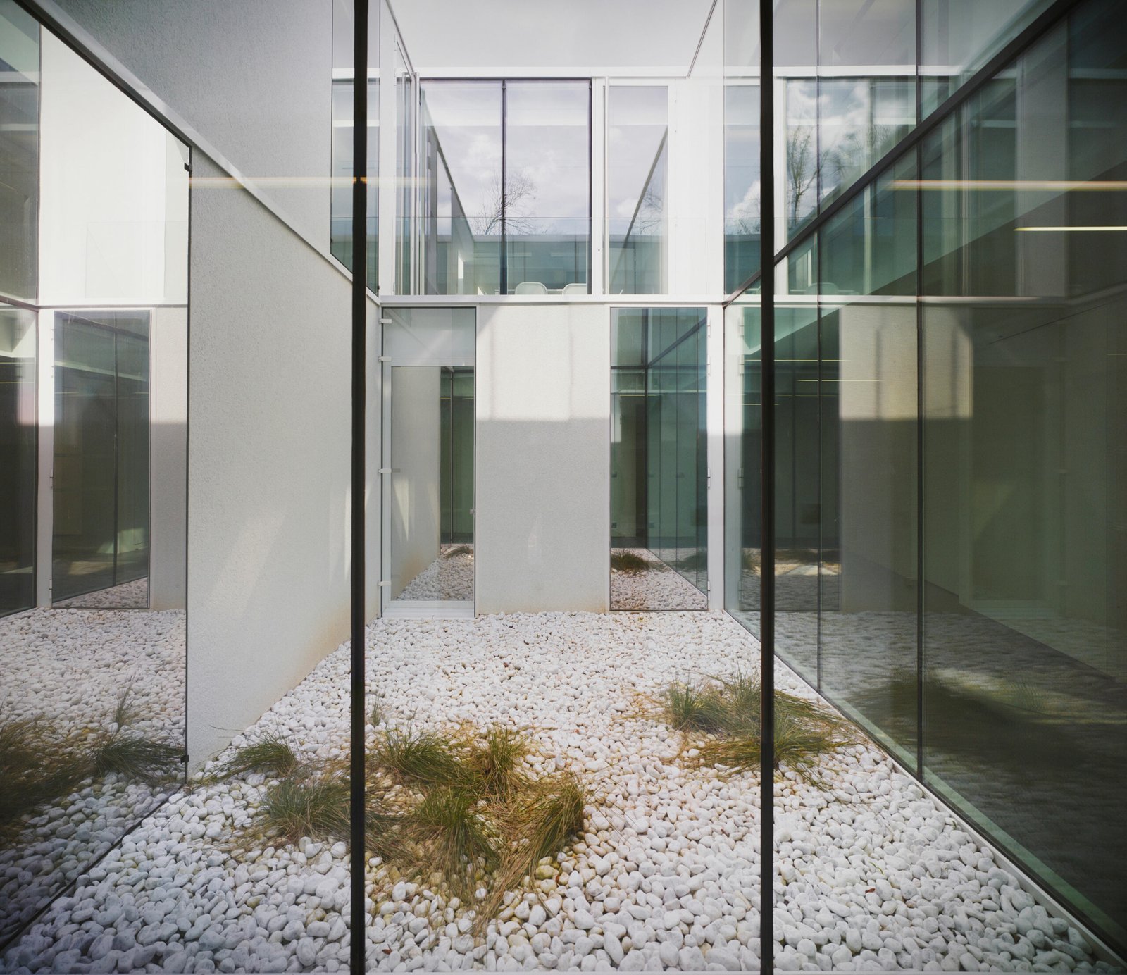La peau en enduit est perlée de billes de verre scintillantes, telles des gouttes de rosée, apportant au bâtiment une aura. Dès la poche d’entrée, c’est un extérieur que l’on découvre. Un des quatre vides organisant l’espace intérieur. En effet, l’unité à rez-de-chaussée se développe autour de 3 patios. Les chambres sont traversantes, organisées autour du grand patio central, et donnant vers le jardin périphérique qui rassure avec ses murs de soutènement épais recouverts de végétal. Chaque chambre en possède un morceau au travers d’un grand bout de verre toute hauteur projetant la vue vers l’extérieur. La chambre, individuelle, petite, est « domestique ». Le lit est en creux dans une alcôve, le bureau encastré dans le mur et la salle de bain dissimulée derrière une porte sous tenture camouflée dans la couleur.