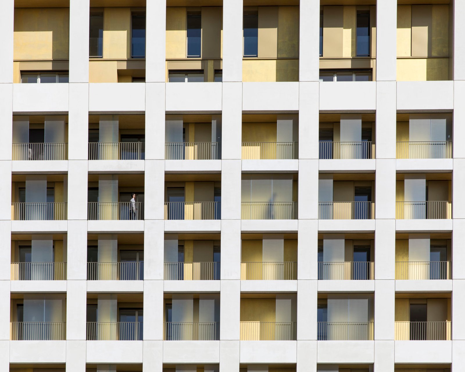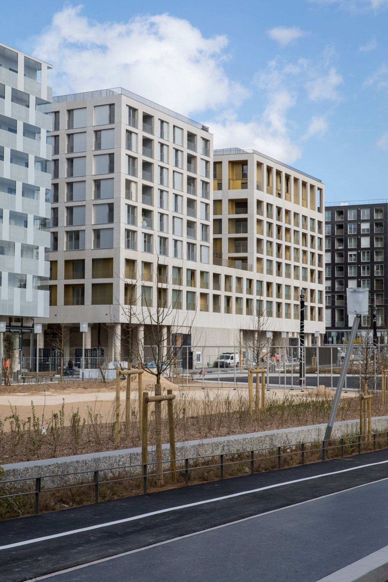Sur le plot Ouest, la grille possède des remplissages légers dans la trame avec une finition aluminium anodisé naturel et des loggias plus en creux. Ces remplissages sont pensés pour être démontables à long terme pour reconfigurer la façade dans le cas d’une mutation des fonctions (logements facilement transformables en bureaux ou création de typologies différentes de logement).