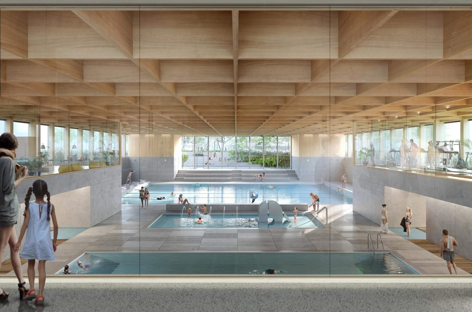 Afin de répondre au mieux aux enjeux urbains et programmatiques nous avons choisi de semi encastrer la piscine pour offrir un gabarit réduit et une volumétrie plus riche à l’extérieur comme à l’intérieur.