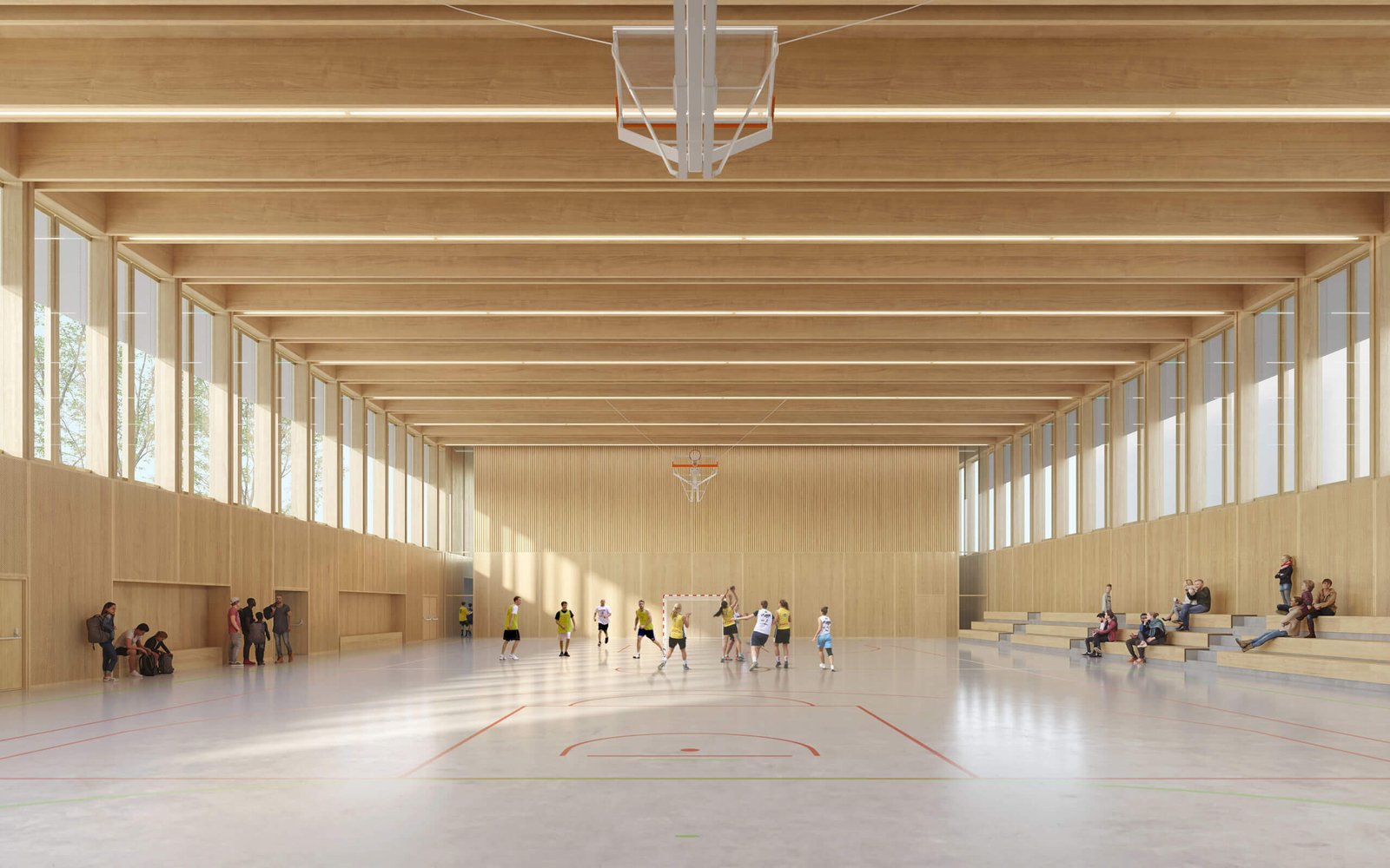 La disposition semi-encastrée du projet rapproche le gymnase du hall (utilisé par les scolaires aussi régulièrement que la piscine) avec des circulations verticales réduites.