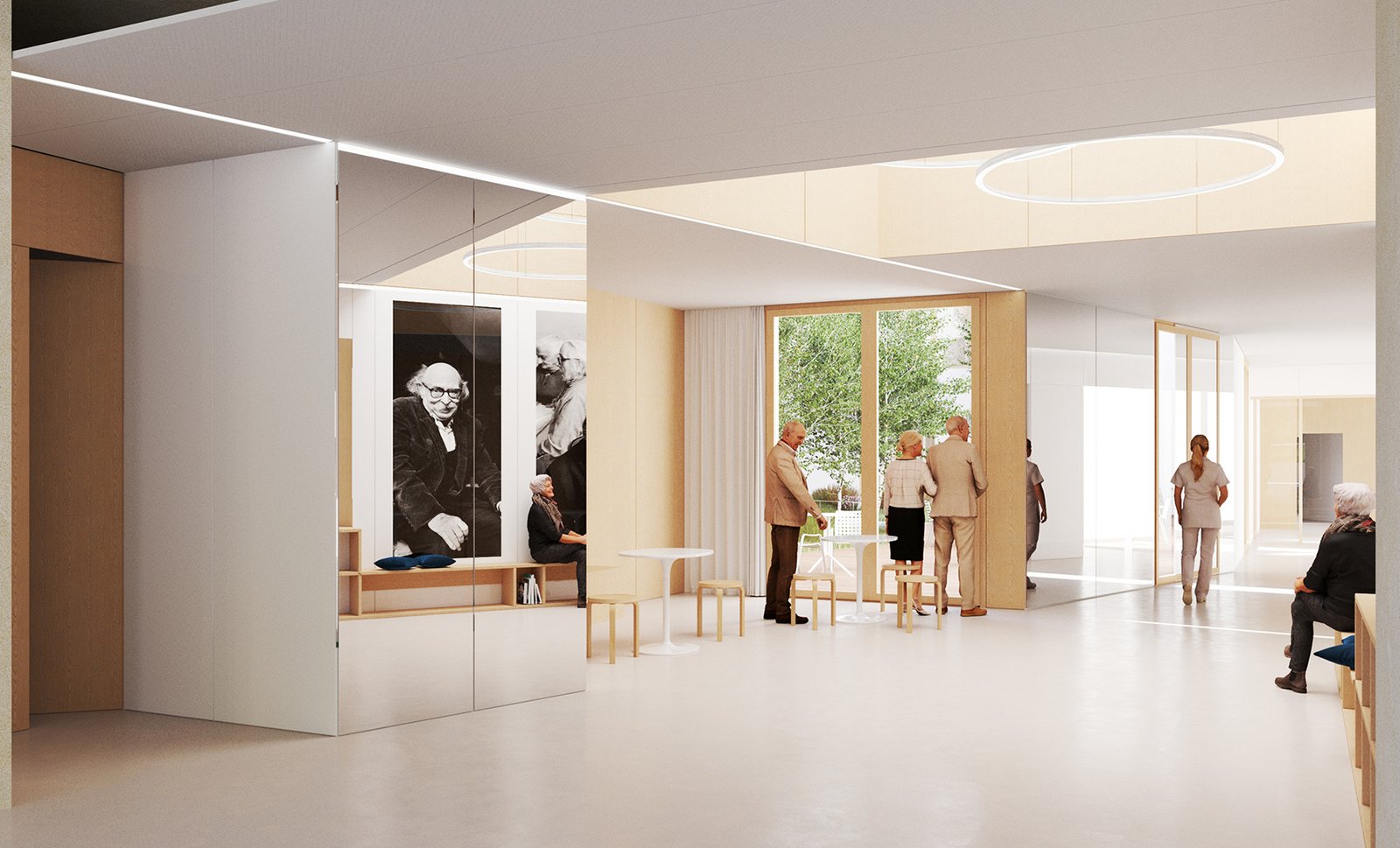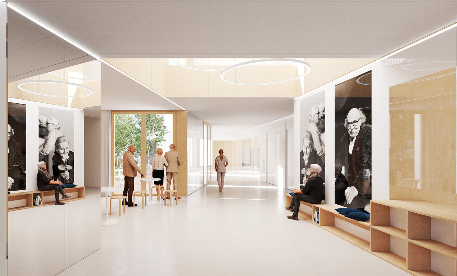 A tous les niveaux, l’organisation spatiale autour des patios permet une circulation continue et fluide, offre une qualité de lumière et de vues ainsi qu’une sécurité et un confort visuel et la surveillance par le personnel encadrant. Les dégagements sont éclairés naturellement, généreusement dimensionnés et sans impasse, ils offrent des zones de rencontres informelles pour les résidents et leurs visiteurs.