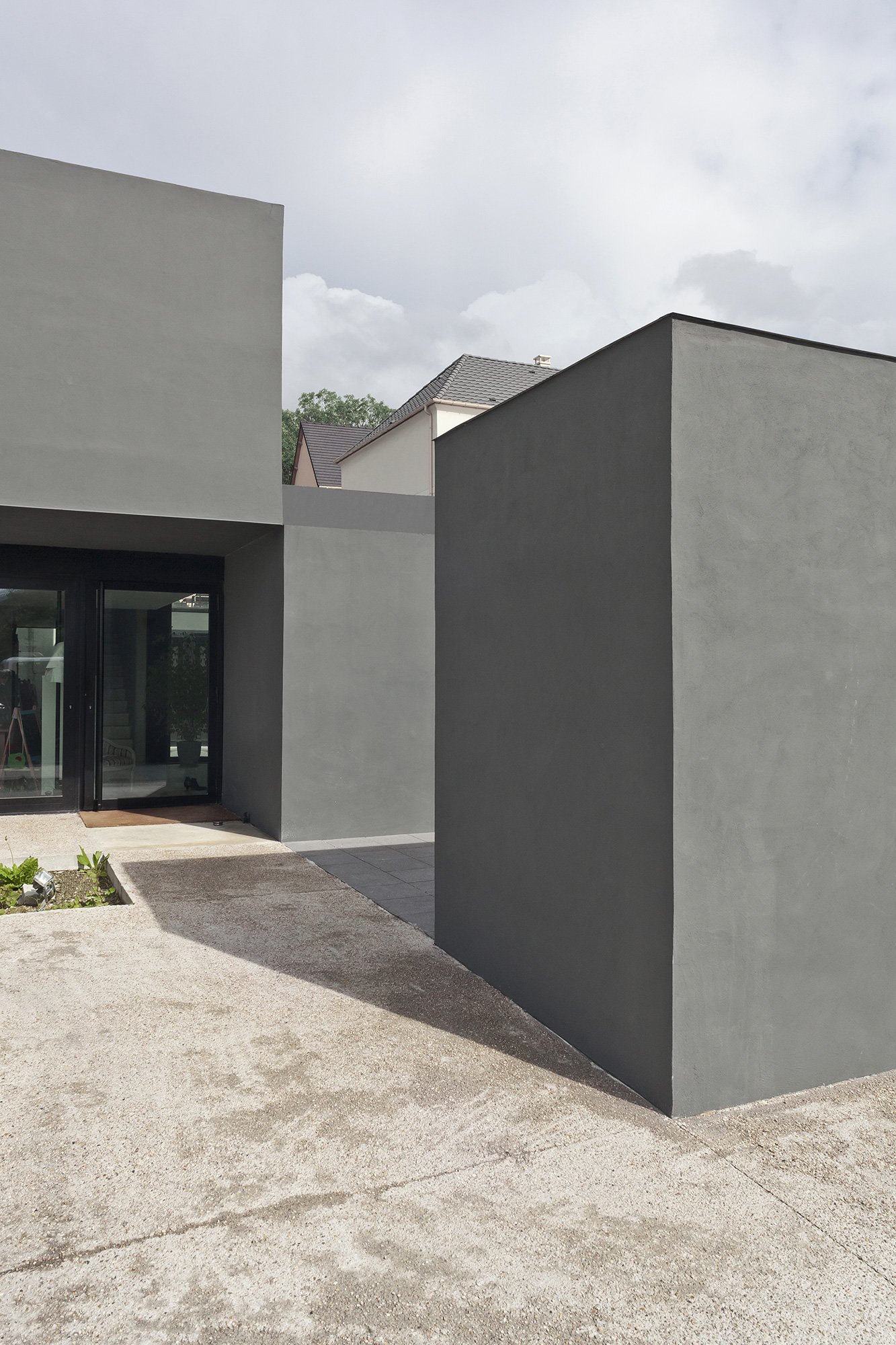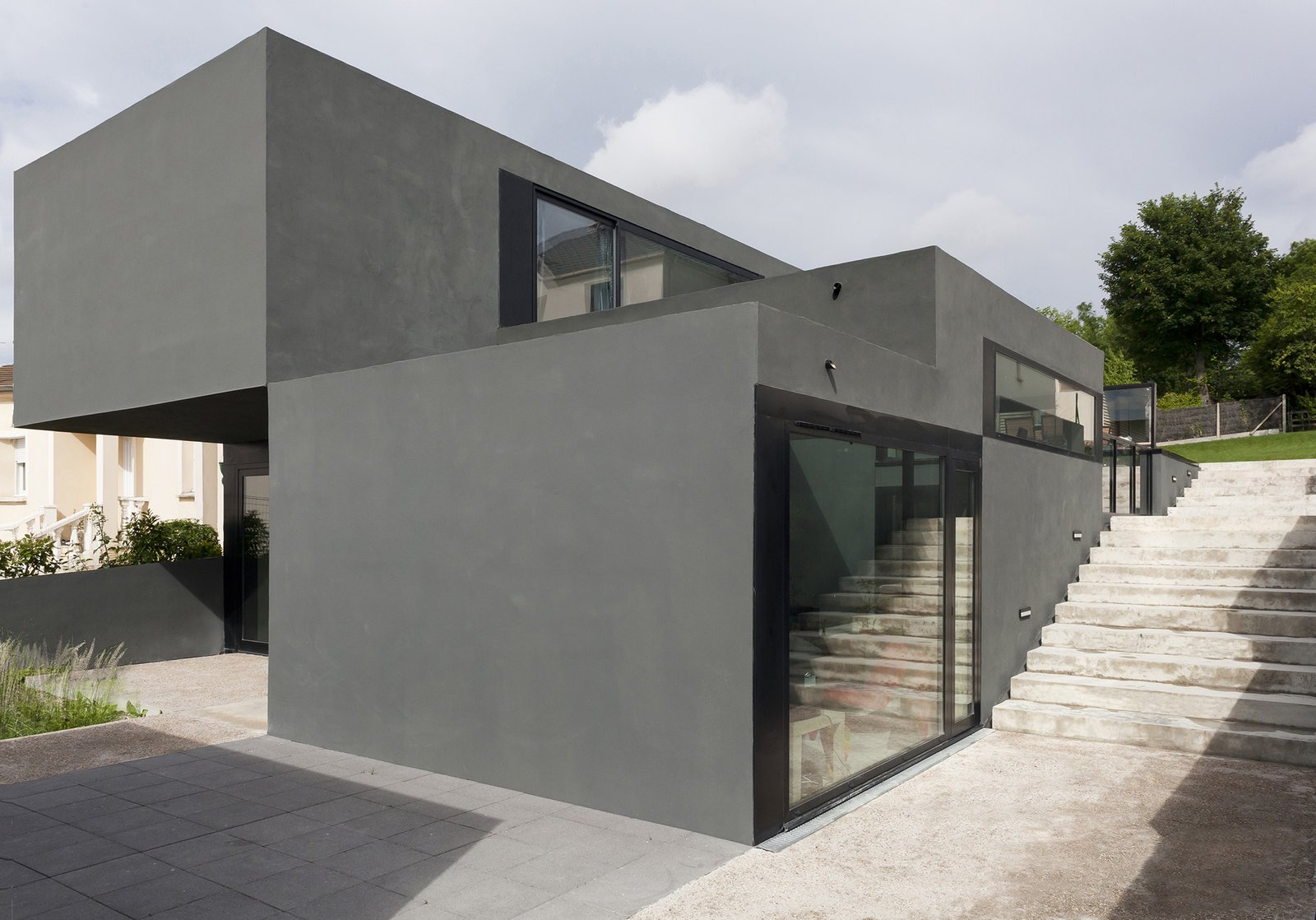 L’aspect extérieur du bâtiment est opaque et sombre (enduit anthracite).