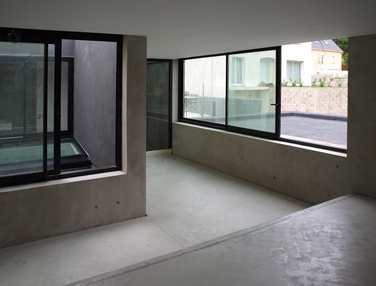 Ce faisant, elle bénéficie de l’inertie thermique de la terre et limite son linéaire de façade. La maison possède peu d’ouvertures vers l’extérieur et s’ouvre sur plusieurs patios. Elle se positionne en recul par rapport à la voie, laissant ainsi deux places de stationnement extérieur (traitement de sol perméable). Elle s’accole en mitoyenneté sur sa limite nord (façade aveugle). Côté sud, la construction se recule de 2.5 m par rapport à sa limite.