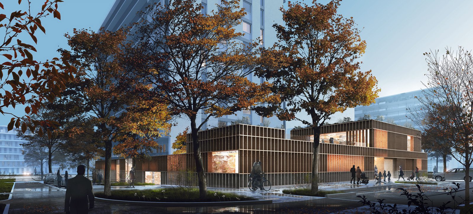 Le volume du projet développe un socle poreux, entre intérieur et extérieur, affirmant la présence d’un équipement public dans la dynamisation du quartier.